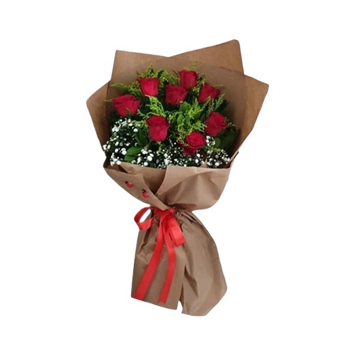 Kraft kağıdına sarılı 8 adet kırmızı gülden oluşan buket.